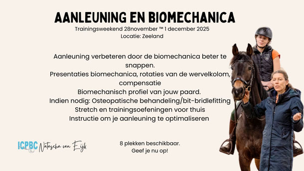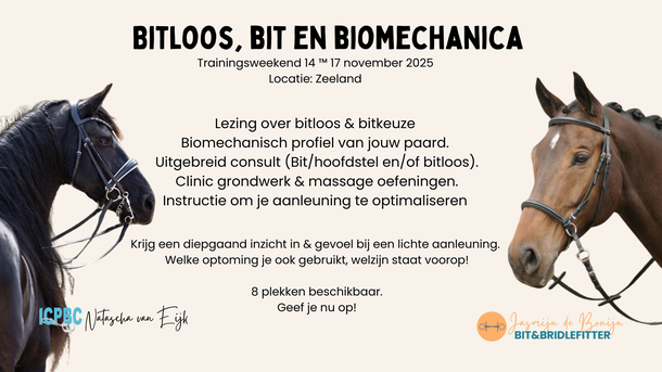 In deze 4 dagen brengen we (Jasmijn de Bruijn en Natascha van Eijk) jouw paard volledig in beeld in bouw, houding, biomechanica en reacties op bitten en hoofdstellen. Maar dat is uiteraard het niet het enige wat we doen! Je krijgt praktische tools voor thuis waar je nog maandenlang van kunt profiteren. Klik op de foto hierboven voor meer informatie en een gratis demonstratie video.